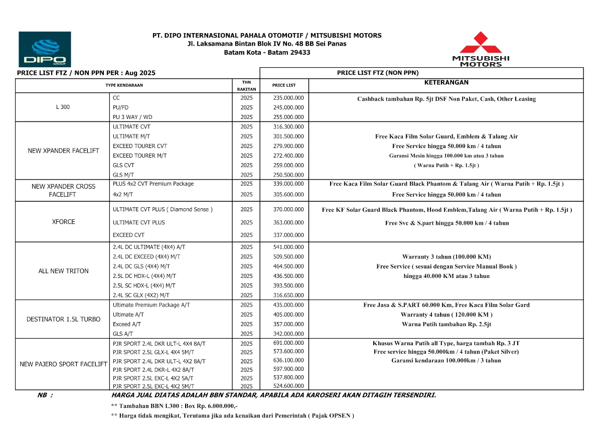 Harga Terbaru Mitsubishi Batam – Update Agustus 2025