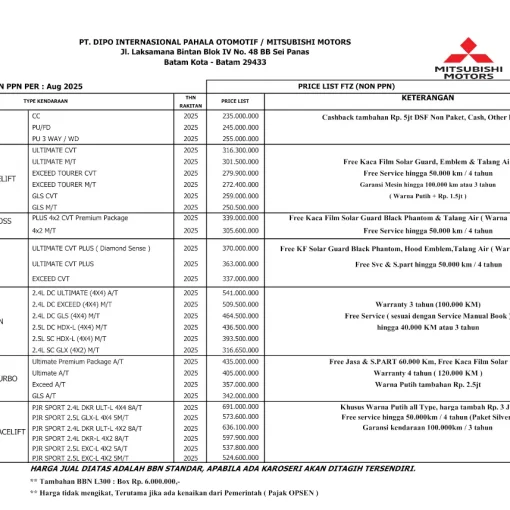 Alamat Dealer Mitsubishi Batam Jl. Laksamana Bintan Blk. IV No.48bb, Sungai Panas, Kec. Batam Kota, Kota Batam, Kepulauan Riau 29433 Kontak Sales Executive: PERDI SIREGAR 0822 9377 4448 (Call/WhatsApp Map: